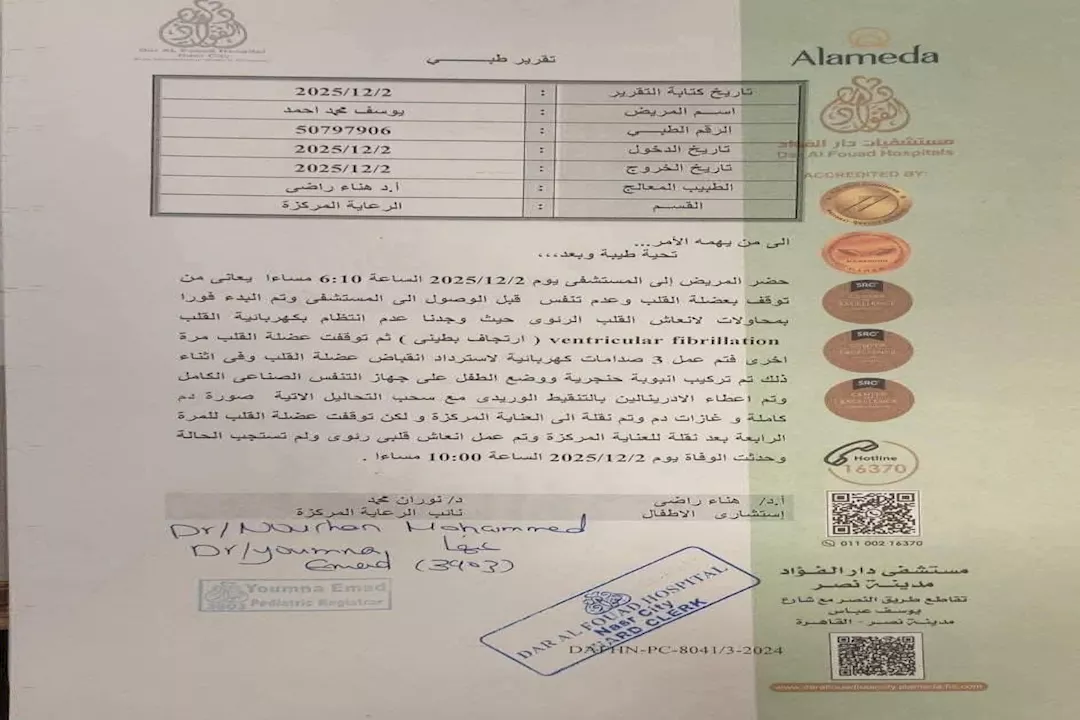 وحصل موقع "الكونسلتو" على نسخة من التقرير الطبي الذي سجّل بالتفصيل اللحظات الأخيرة في حياة اللاعب الصغير يوسف محمد، كاشفًا أن قلبه توقّف 4 مرات قبل إقرار الوفاة.