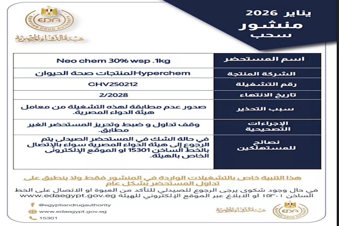 أعلنت الهيئة سحب مستحضر Neo chem 30% WSP – عبوة 1 كجم، من إنتاج شركة Hyperchem لمنتجات صحة الحيوان، وذلك للتشغيلة رقم CHV250212، بتاريخ انتهاء فبراير 2028.