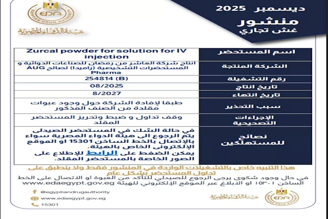 وأوضحت هيئة الدواء في منشور رقم 98 لسنة 2025، أن هناك عبوات مقلدة من مستحضر Zurcal powder for solution for IV injection، إنتاج شركة العاشر من رمضان للصناعات الدوائية والمستحضرات التشخيصية "راميدا" لصالح AUG Pharma،