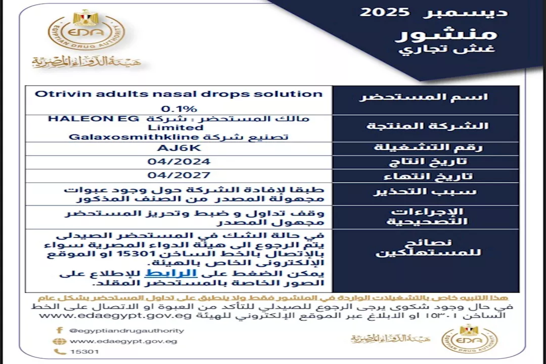 أصدرت هيئة الدواء المصرية، منشورا رسميا للتحذير من غش تجاري يتعلق بمستحضر Otrivin Adults Nasal Drops Solution 0.1%، بعد ورود إفادة من الشركة المالكة بوجود عبوات مجهولة المصدر متداولة بالأسواق.