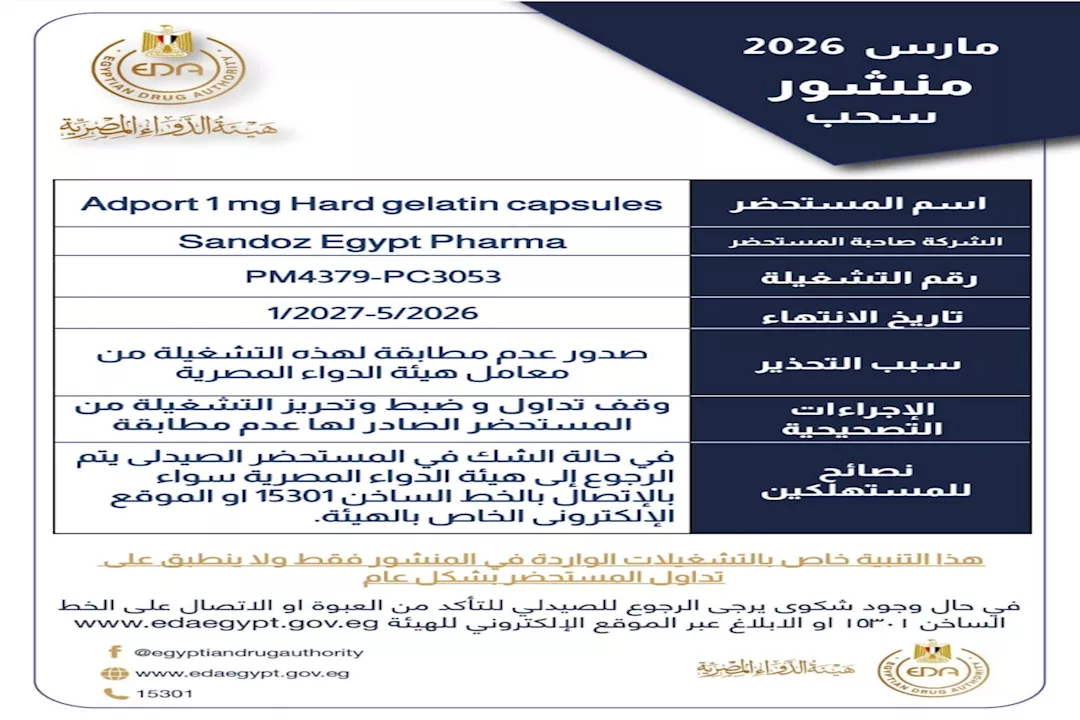 وأوضحت الهيئة في منشور رسمي أن التشغيلة التي تقرر سحبها تخص دواء Adport 1 mg Hard gelatin capsules، من إنتاج شركة Sandoz Egypt Pharma، وتحمل رقم التشغيلة PM4379-PC3053، مع تواريخ انتهاء تتراوح بين مايو 2026 ويناير 2027.