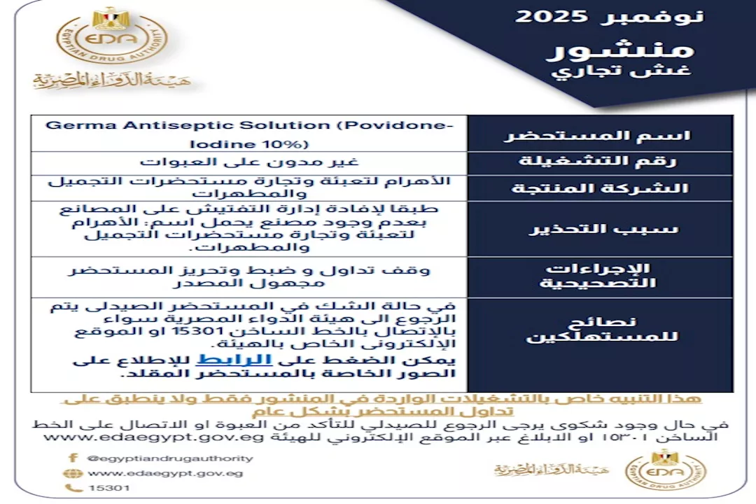 وأوضحت هيئة الدواء في منشور توعوي حمل رقم 91 لسنة 2025، أن هناك تداولًا لعبوات مجهولة المصدر من المستحضر الدوائي Germa Antiseptic Solution (Povidone